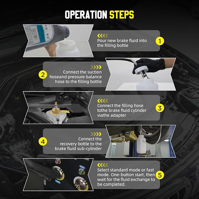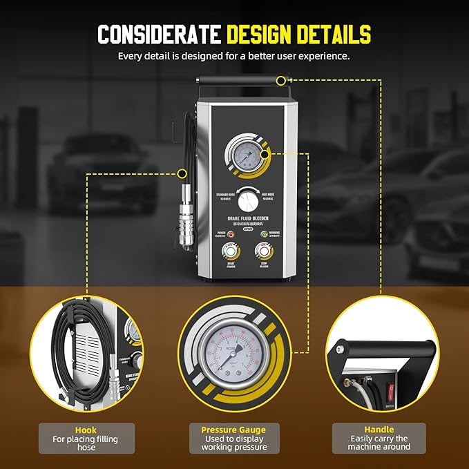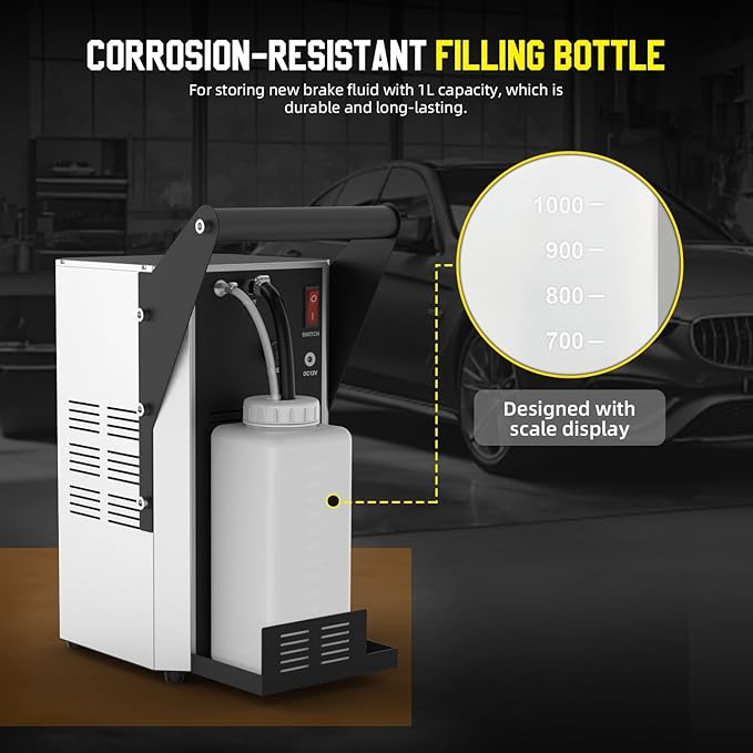 - 【Fluid Shortage Protection & Friendly design】Fluid Shortage Protection,When the new brake fluid container is empty during filling, vacuum brake bleeder will automatically stop working to prevent air from entering the car brake fluid container. Handle,Easily carry the machine around;Pressure Gauge,used to display working pressure;Hook, For placing filling hose. Corrosion-resistant filling bottle with 1L capacity, which is durable and long-lasting.