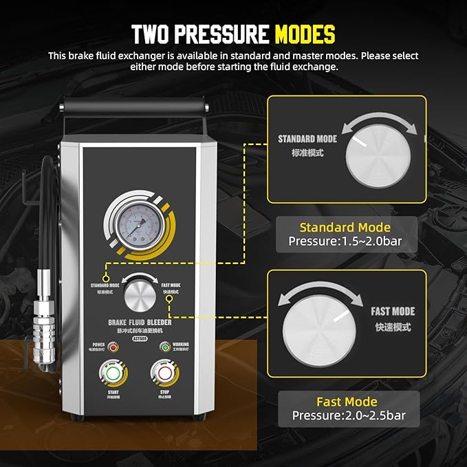 - 【2 Pressure Modes & 2 Power Supply Modes】AST609 brake system bleeding tools support 2 Pressure Modes,Standard Mode (1.5~2.0bar) & Master Mode (2.0~2.5bar). The Brake Fluid Bleeder Machine supports 2 types of power supply methods,support 12V Battery Power supply and 110V or 220VElectric supply Socket.