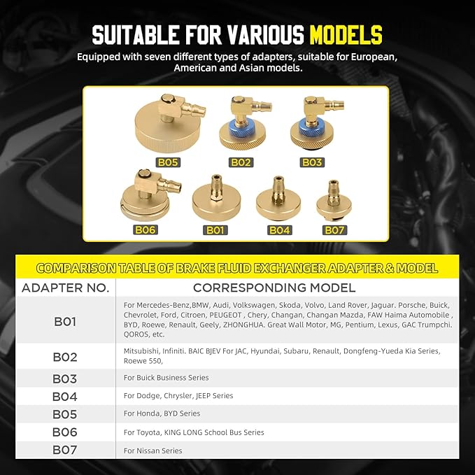 - 【Pressure Detection & 7 Adapters】Brake bleeder kit has a built-in working pressure pump, no need for an external vacuum pump. It also has a built-in pressure monitoring device. If pressure cannot be built up or the pump sucks in air, the pump will automatically shut down, preventing air from being injected into the vehicle brake fluid reservoir. The Automatic Brake Bleeder Kit Equipped with seven different types of adapters, suitable for European.American and Asian models.