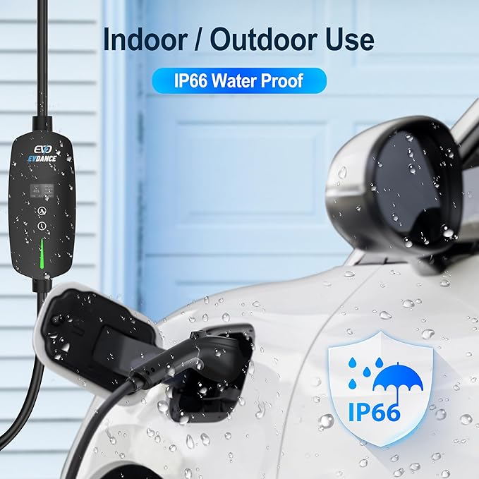 - ✅【IP66 Waterproof - Safe Indoors & Outdoors】Built for all weather conditions—rain, snow, heat, and dust. With IP66 waterproofing and full safety protections (over-heat, over-current, short-circuit, low-voltage, over-voltage), your charging sessions remain stable and secure.Perfect for garage, driveway, workplace, or on-the-go charging.