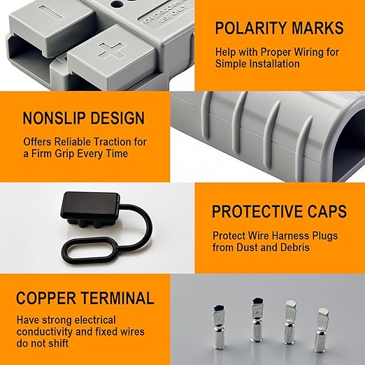 - 2-Pack Quick-Connect Kit for 4 AWG Wires - This set includes 2 genderless plugs designed for 4 gauge wires, supporting up to 50A current for reliable battery and power connections.