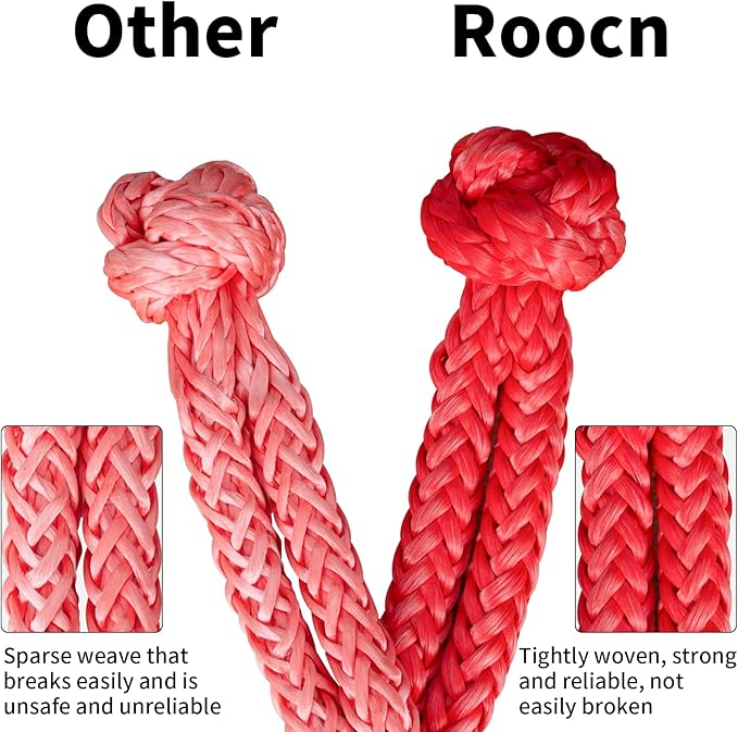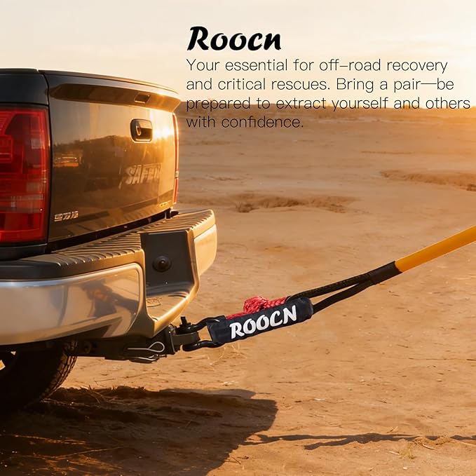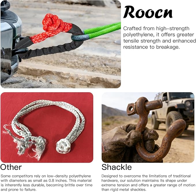 - 【Lightweight and Super Safe】 Each of Roocn soft shackles weighs in at a mere 7 ounces, a far cry from those heavy, bulky metal ones. And safety? Big deal! If the towing rope snaps and the shackle goes flying, you don't have to worry about it smashing into your car or hurting someone. These lightweight synthetic shackles are a game-changer, and that's why they're so popular among smart adventurers.