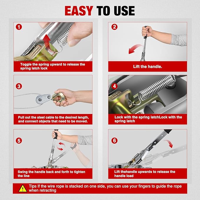 - DURABLE STEEL CABLE: The heavy duty come along cable puller hand winch comes with 10 ft/3M high carbon steel cable with a smooth galvanized finish, which has strong corrosion and abrasion resistance, providing reliable performance no matter what the outdoor environment.this come along hand winch excels in a broad range of lifting and pulling scenarios
