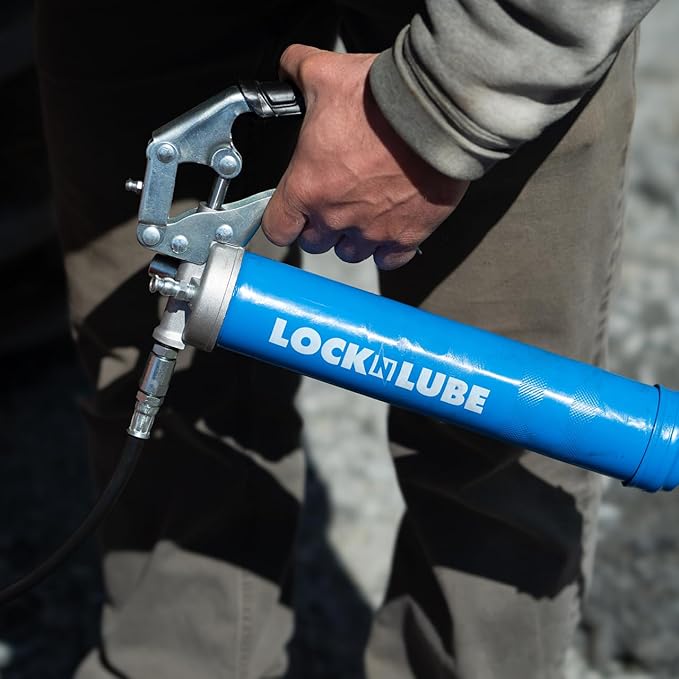 LockNLube Heavy-Duty Pistol Grip Grease Gun (Blue). Includes our patented LockNLube® Grease Coupler (Locks On, Stays On, Won't Leak!) plus a high-quality 20" hose and in-line hose swivel