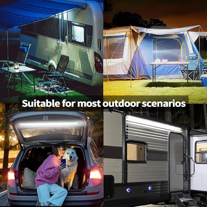 - 【HIGH BRIGHTNESS】:This RV awning lights is equipped with 72 SMD 2835 LED chips, low energy consumption and high lighting efficiency, powered by 12DC input, it can provide 1200 lumens of high brightness, perfect for outdoor activities and off-road.