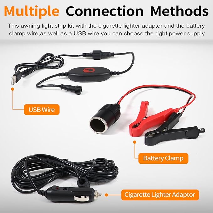 - 【MULTIPLE CONNECTIONS】:The camping awning light has three different connections.1. Harness with cigarette lighter connector to support automotive power.2. Harness with battery clip to support battery power.3. Harness with USB adapter to support USB power.