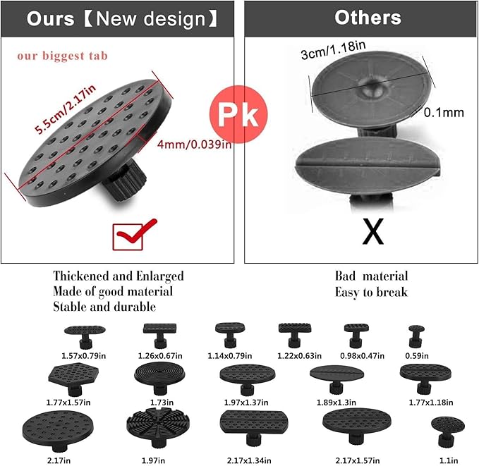 - HIGH QUALITY MATERIAL: T bar slide hammer dent puller made from tempered high carbon stainless steels and standard stainless steel. The 16 pure black glue tabs are all made of high-reliability plastic and they are thickened and widened. So this paintless dent kit will very dura-ble and no worried it break.