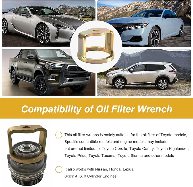 - Compatibility of Oil Filter Cup Wrench: Oil filter wrench removal tool compatible with toyota and other model nissan, honda, lexus, scion 4, 6, 8 cylinder engines