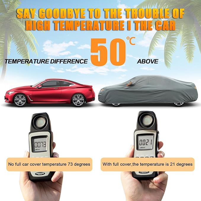 - 【High quality material】-Kayme car cover is made of 180G 5 layer non-woven fabric. The inner membrane has a good waterproof effect and is very suitable for rain and snow protection. 2. The multilayer non-woven fabric has good sun protection and UV protection performance, and can keep the car cool in summer. 3 Thick and soft lining will protect your vehicle