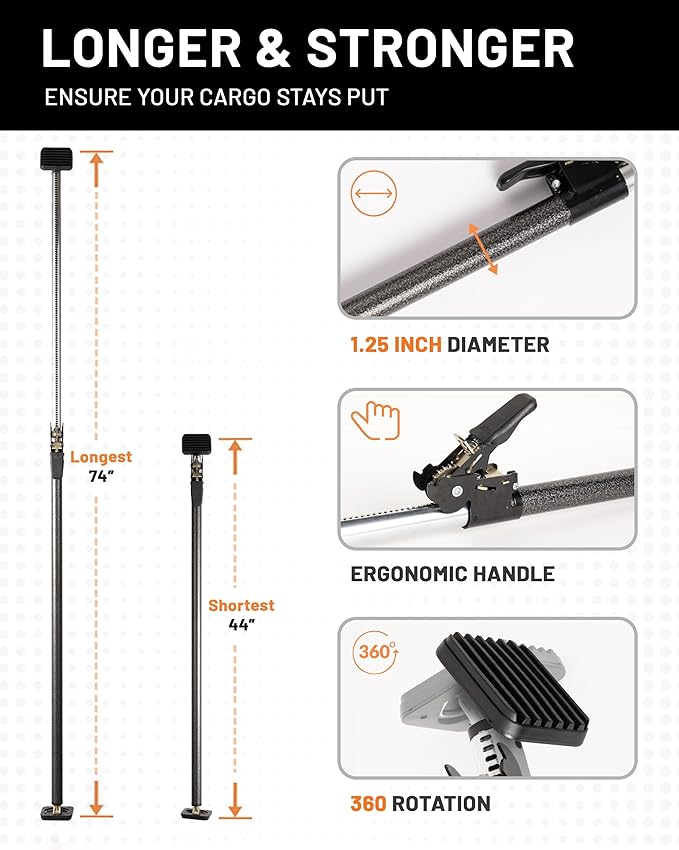 - LONGER AND STURDIER. We've got your needs covered! Our load bar is longer (44 to 74 in.) and sturdier (1.25 in. dia.) than the rest, ensuring superior support for your precious cargo.