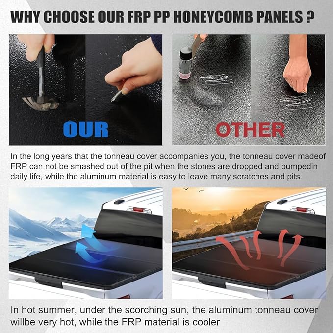 - 4.Quality Materials: Premium quality aluminum is built to last, and the super-strong, lightweight alloy resists dents, scratches, UV rays and weather extremes. Matte black finish stays colorfast for years.Easy to install- CAREONLINE truck bed cover is easy to install and remove, instructions and mounting hardware are included.