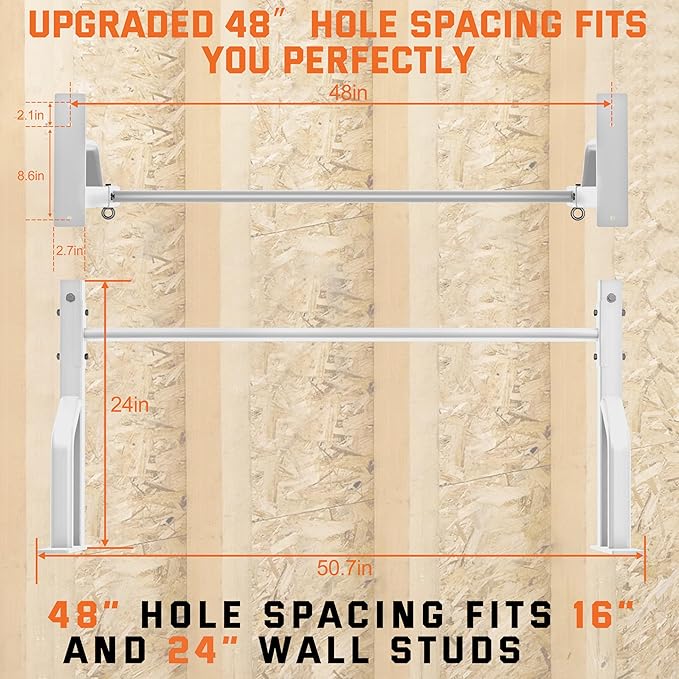 - 【Easy Installation & Space-Saving】 — The joist pull up bar is 48" wide and mounts directly to your wall stud at 48 inches (fitting both 16" and 24" studs) ,It can be easily fitted on walls or ceilings and is compatible with wooden and concrete surfaces. Now, you can have your upper body workout without sacrificing floor space.