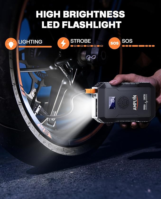 Car Battery Jump Starter with Air Compressor 160PSI,5000A 60W Portable Jump Starter Battery Pack (All Gas/10L Diesel),12V Starter Jump Box with Jumper Cables,Type C Fast Charging,3 Mode Light
