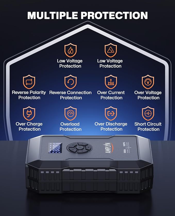 - 【Advanced Safety Features】: Jump start battery pack with 10 intelligent safety protections, from overcharging to reverse polarity, this portable car jump starter provides peace of mind in extreme temperatures (-4°F to 140°F), ensuring safe operation for both beginners and experts.