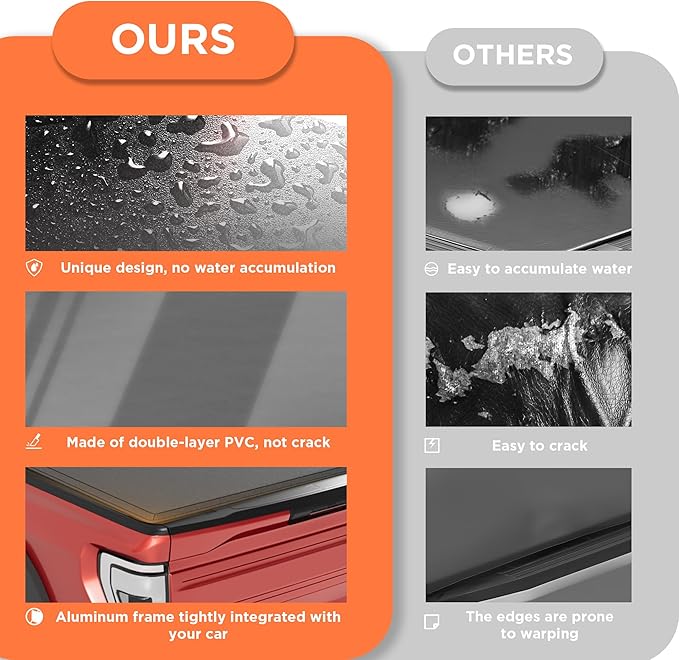 - 【Easy To Install】Our truck bed cover is easy to install without drilling holes. With the provided instructions and hardware installation, it can be quickly completed within 20 minutes.