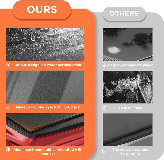 - 【Premium Quality】The Ford F150 tonneau cover is made of high-quality vinyl material with double-layer coating technology, combined with reinforced stainless steel fixtures and durable side rail design, which has excellent durability, tear resistance, waterproofing, and high temperature resistance.