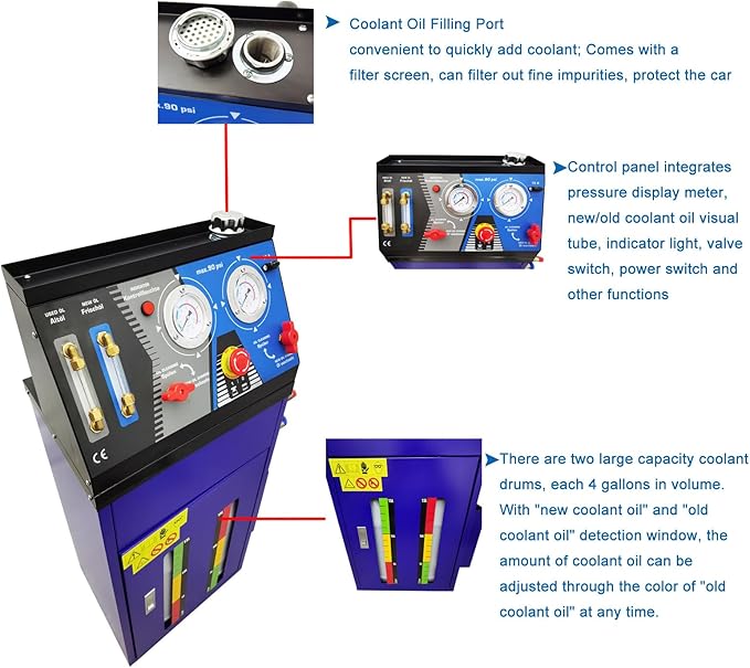 - Easy to Operate: The control panel includes pressure display meter, new/old coolant oil visual tube, indicator light, valve switch, power switch and other functions, which is clear and easy to understand, easy to operate