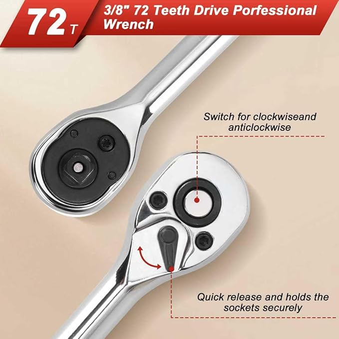 - 【Multi-purpose】: 3/8 standard and deep socket set is able to satisfy various maintenance demands of home improvement, car repair, vehicle repair and mechanism, other DIY projects. Value gift for men on various occasions like Father's Day, Birthday or anniversary.