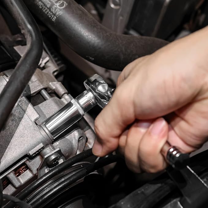 - 【6-Point Socket Design】: This mechanic tool kit features a 6-point flank drive design that provides a secure grip on fasteners while preventing damage to their corners, effectively minimizing the risk of rounding. It comes with 3", 6" extension bars and 360° universal joint that allows access to narrow area and flexibly change angle. Saving time and labor for more efficient.