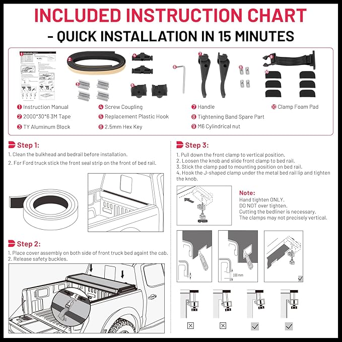 - CLAMPS AND LATCHES ENSURE SAFETY AND SECURITY: Tonneau cover waith clips and latches quickly secure and lock the cover to keep it tight and noiseless and protect cargo from the elements, no drilling required supports up to 450 lbs