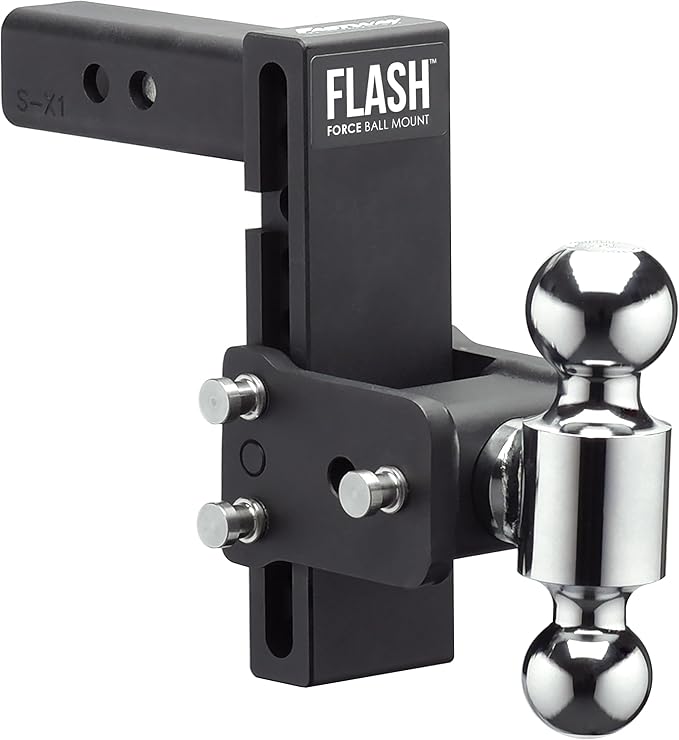 - ADJUSTABLE & VERSATILE – The FLASH Force Adjustable Ball Mount Trailer Hitch offers customizable height settings for balanced towing. Adjust it effortlessly by removing the two stainless steel pins to raise or lower the hitch, tailoring it to your specific vehicle and trailer pairing. Switch between ball sizes in seconds by rotating the ball assembly. When towing is done, flip the hitch under your vehicle.