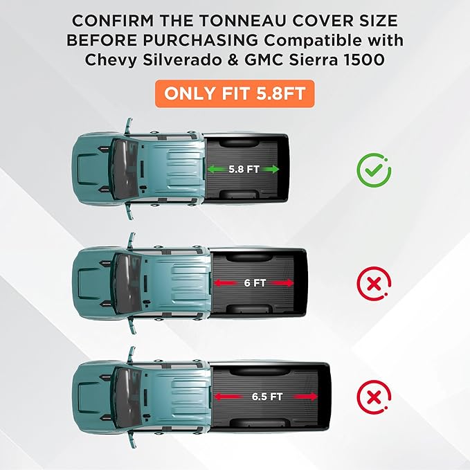 - 【Fitment】Compatible with the 5'8" bed of 2007 2008 2009 2010 2011 2012 2013 2014 2015 2016 2017 2018 2019 2020 2021 2022 2023 2024 2025 Chevrolet Silverado and GMC Sierra 1500 new body style(DO NOT FIT Multi-flex tailgate),please measure your lathe size and confirm the car model before ordering.