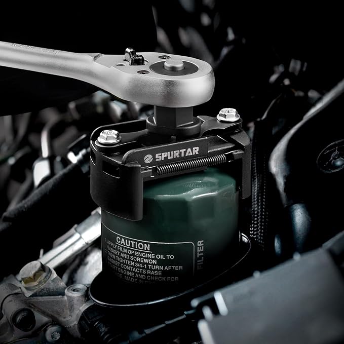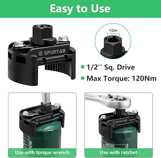 - Application: Spurtar oil filter wrench removes small and medium-sized spin-on oil filters, from 2-3/8 to 3-1/8 inches (60mm-80mm) in diameter. Use a 1/2'' Sq. drive ratchet wrench (not included). Warm Tips: Recommend installing the new oil filter by hand only (Once the gasket on the filter contacts the engine surface, tighten it an additional 3/4 to 1 full turn by hand)