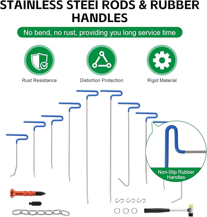 - 【Paint-Safe Stainless Steel Tools】All PDR tools are made of rust-proof stainless steel with anti-slip rubber handles. Remove dents without scratching your car's original paint - keeps your vehicle looking new.