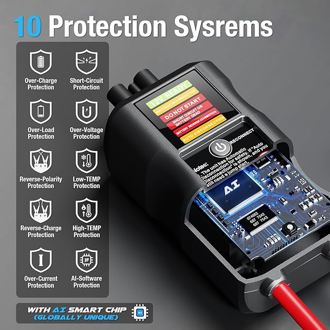 - 【INTELLIGENT SAFETY YOU CAN TRUST】 — This battery jumper starter portable features an integrated battery and smart clamp design, armed with 10 layers of intelligent protection. It guards against short circuits, reverse polarity, sparks, overheating, and more, ensuring safe operation for both you and your vehicle. Enhanced thermal efficiency and power management extend the jump box’s lifespan, preventing damage from loose connections or battery issues.