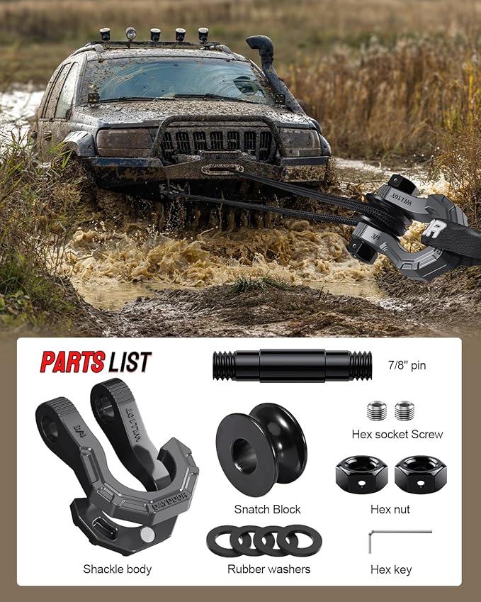 - Quick and Easy Installation:With DAYDOOR D ring shackle snatch block,you can easily install the tow strap on the shackle.The design allows you to hook a chain, winch rope, or tow strap without taking the shackles apart once installed. The 3/4” shackle D rings, combined with the 7/8 pin, ensure a secure and reliable connection. In rescue work, it is very important to avoid wasting time due to cumbersome installation. Compared with basic snatch blocks that require additional purchase of connectors like shackles or soft shackles to attach ropes. DAYDOOR D Ring Shackles with Towing Pulley Block eliminates the need for additional accessories during use