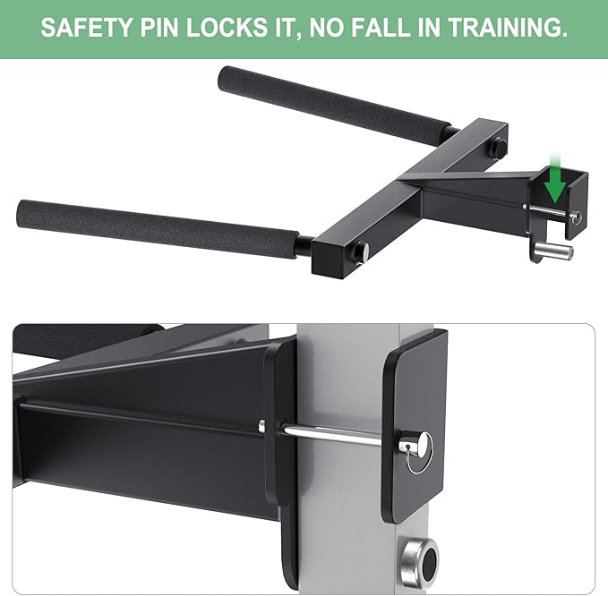 - 【Quick & Easy Installation】Slide the Y-Dip Bar into the power cage and secure it with the included safety pin. Adjustable height and position offer a customized and comfortable workout experience.