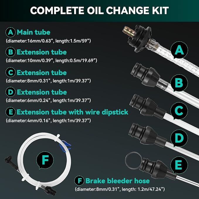 - Complete Oil Change Kit: This comprehensive set comes equipped with a 59" main tube and 4 extension tubes of varying size, extending up to 98.4" in total, allowing you to effortlessly reach the bottom for a thorough oil change. Also comes with a brake bleeder hose for your various needs