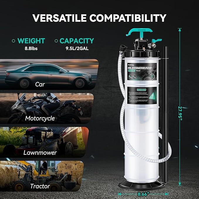 - Dual-Mode Flexibility: Poafamx oil extractor pump boasts both pneumatic and manual modes. The pneumatic mode, requiring connection to an air compressor, delivers unparalleled oil changing efficiency. While the manual mode ensures hassle-free oil change anytime, anywhere, without the need for additional equipment