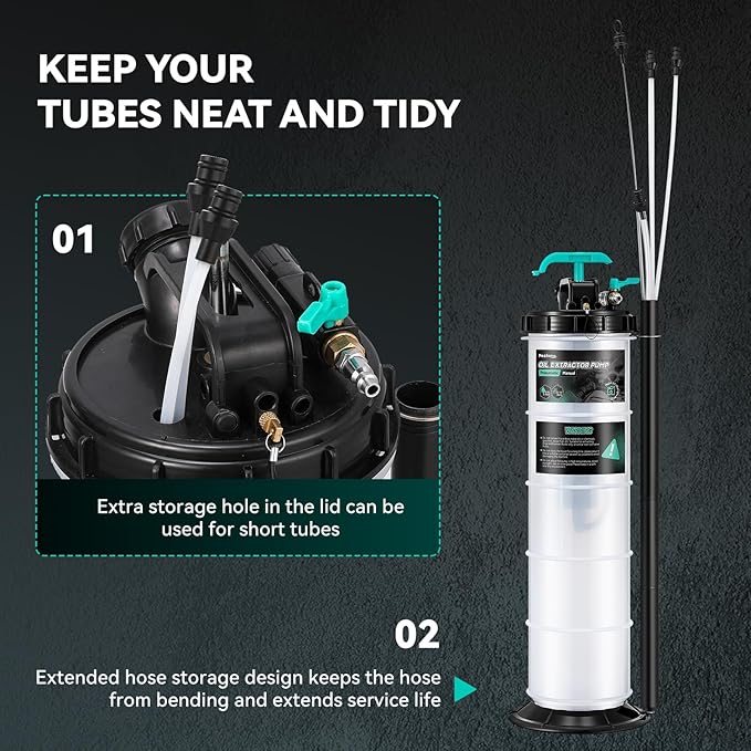 - Organized Hose Storage: Say goodbye to tangled messes! Our pump features an extended hose storage design that keeps your suction hoses neatly organized and within easy reach, making operation a breeze