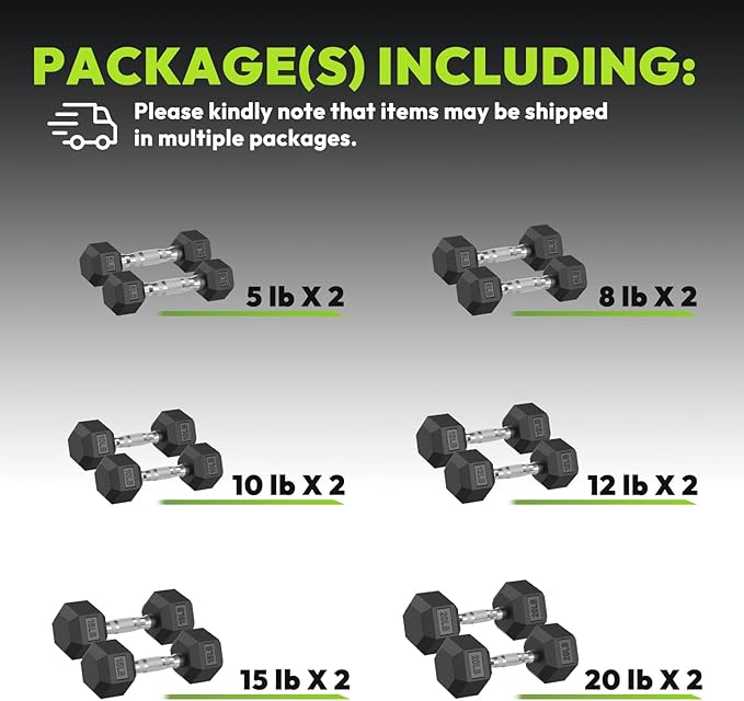 - Premium Rubber Encasement: Include a pair of ( 5 lb 8 lb 10 lb 12 lb 15 lb 20 lb ) hex dumbbell weight made from solid cast iron cores and virgin rubber coating, these dumbbells resist cracking and fading while protecting both your floors and equipment. The durable rubber shell absorbs impact for quieter workouts.