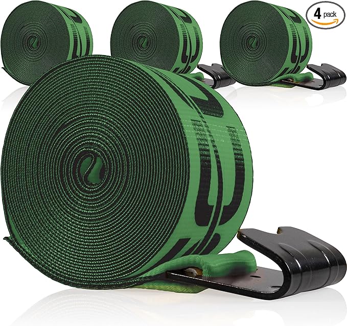 US Cargo Control Winch Straps 4" x 30' (4-Pack), 5,400 LBS Working Load Limit, Heavy Duty Flatbed Tie Downs with Flat Hooks, Green 4 Inch Straps for Flatbed Trailer, Truck, and Cargo Securement