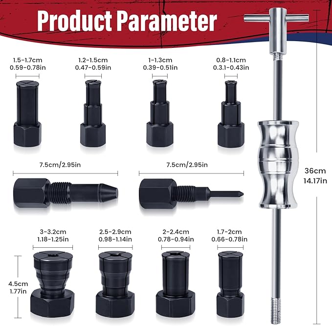- BEARING PULLER SET - The slide hammer puller set features 8 expandable collets (8–32mm / 5/16"–1-1/4") and a 1.2 ft (360mm) slide hammer, all housed in a durable blow-molded case for convenient storage and portability.