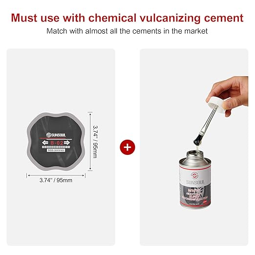 - [Attention]: Our tire patches must use with chemical vulcanizing cement, otherwise it can’t hold on the tire inner surface. Our patches can fit for mostly famous brand of fluid or cement solutions in the market