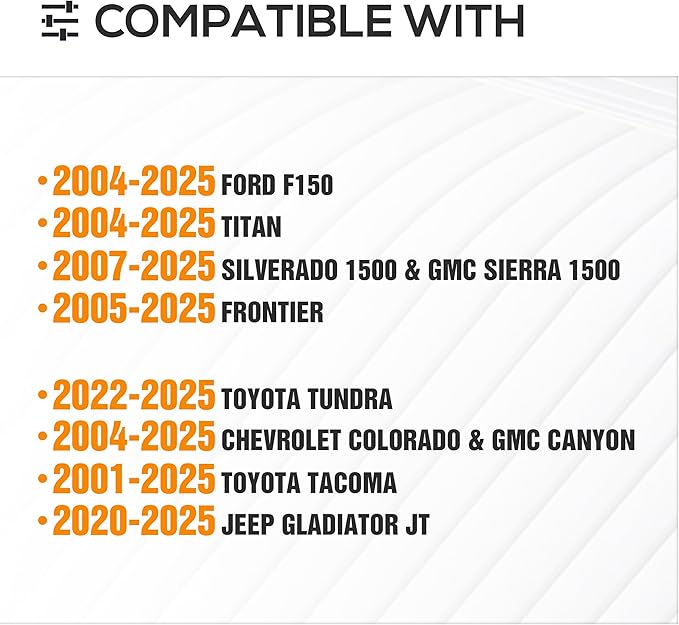 - 【Compatibility】: Adjustable truck bed rack fits most pickup trucks, including 2004-2025 Ford F150, 2001-2025 Toyota Tacoma, 2007-2025 Chevy Silverado & GMC Sierra 1500, 2020-2025 Jeep Gladiator JT, 2004-2025 Titan, 2022-2025 Toyota Tundra, 2005-2025 Frontier, 2004-2025 Chevy Colorado & GMC Canyon. (Not compatible for truck with Tonneau Cover & Bed Cover)