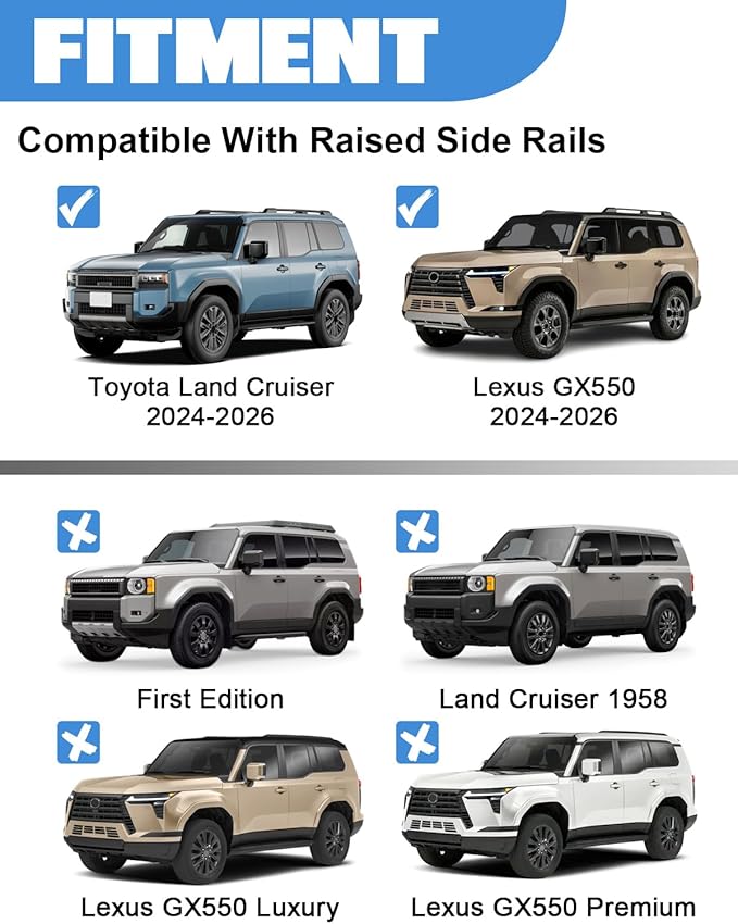 - 【Compatibility】Compatible with Toyota Land Cruiser 250 & Lexus GX550 2024 2025 2026 with Raised Roof Rails. Note: Not for Lexus GX550 Premium and Luxury with Flush Side Rails.