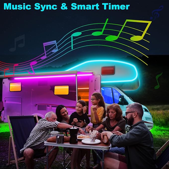 - Music Sync Mode for Party: The RV underglow LED light kit features a dynamic music mode that syncs color changing to the rhythm of your tunes. Perfect for parties or creating a cozy ambiance in your cabin! Whether you're hosting a celebration or relaxing outdoors, these RV awning LED light strip helps elevate your space with enhanced light effects