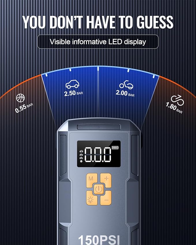 - Smart Cordless Inflator With LCD Screen: Smart preset & auto shut-off without repeated adjustment and check. Large LCD display to read real-time data, 4 optional inflation modes and pressure units switch for easy use. A powerful 150 PSI air compressor can fill a car tire to 20 PSI in just 2 minutes.