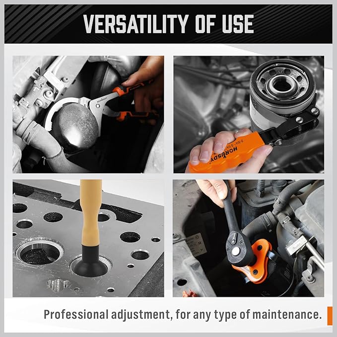 - 11-PIECE COMPLETE SET : Includes 4 swivel oil filter wrenches (2-3/4"–5-1/4"), 2 adjustable oil filter pliers (9" & 12"), valve lapper set, 3-jaw universal socket, and ratchet handle. Fits most cars, SUVs, trucks, and diesel engines, perfect for DIY garage or roadside repairs