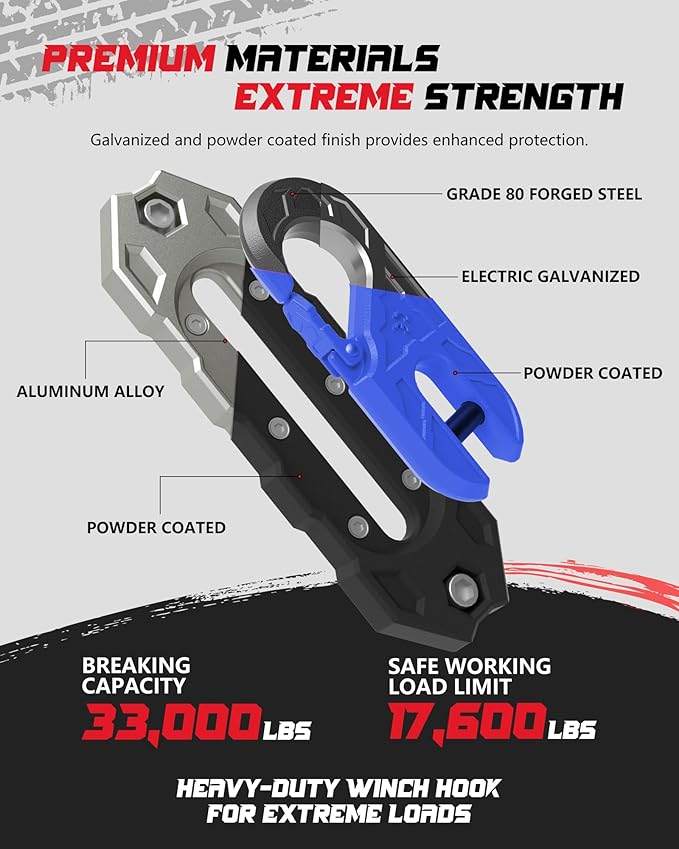 - STRENGTH: Boasts an astounding breaking capacity of 33,000 pounds and a safe working load limit of 17,600 pounds, tailor-made for die-hard off-road enthusiasts, suitable for various vehicles including trucks, trailers, SUVs, and off-road vehicle