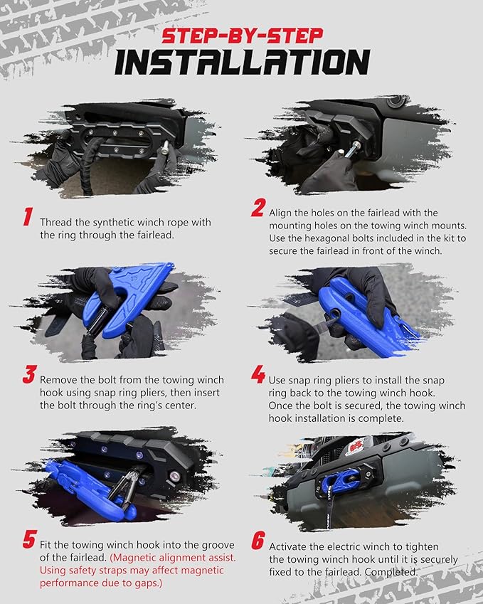 - FEATURES: Easily tightened by the winch, our hook securely locks into the fairlead groove, with newly added magnetic pieces helping to keep it steadier while tightening the synthetic rope, and offering a cleaner, more unified look compared to standard hooks (magnets assist with alignment; final hold comes from winch tension)