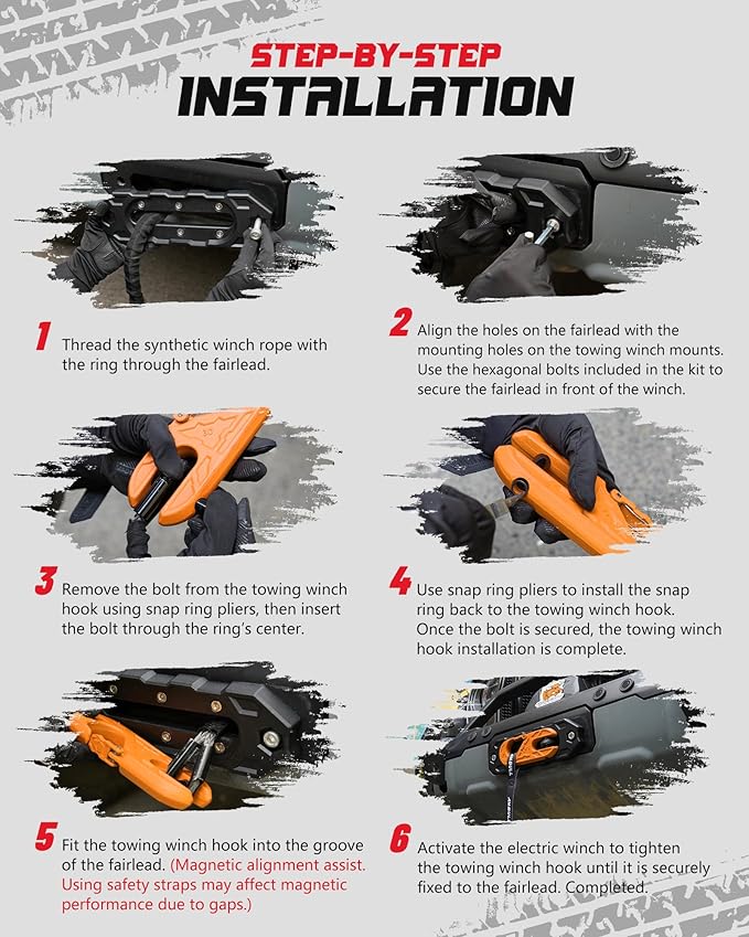 - FEATURES: Easily tightened by the winch, our hook securely locks into the fairlead groove, with newly added magnetic pieces helping to keep it steadier while tightening the synthetic rope, and offering a cleaner, more unified look compared to standard hooks (magnets assist with alignment; final hold comes from winch tension)