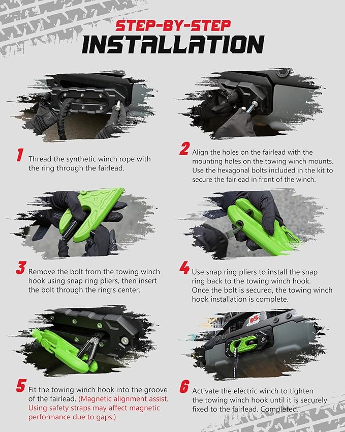 - FEATURES: Easily tightened by the winch, our hook securely locks into the fairlead groove, with newly added magnetic pieces helping to keep it steadier while tightening the synthetic rope, and offering a cleaner, more unified look compared to standard hooks (magnets assist with alignment; final hold comes from winch tension)