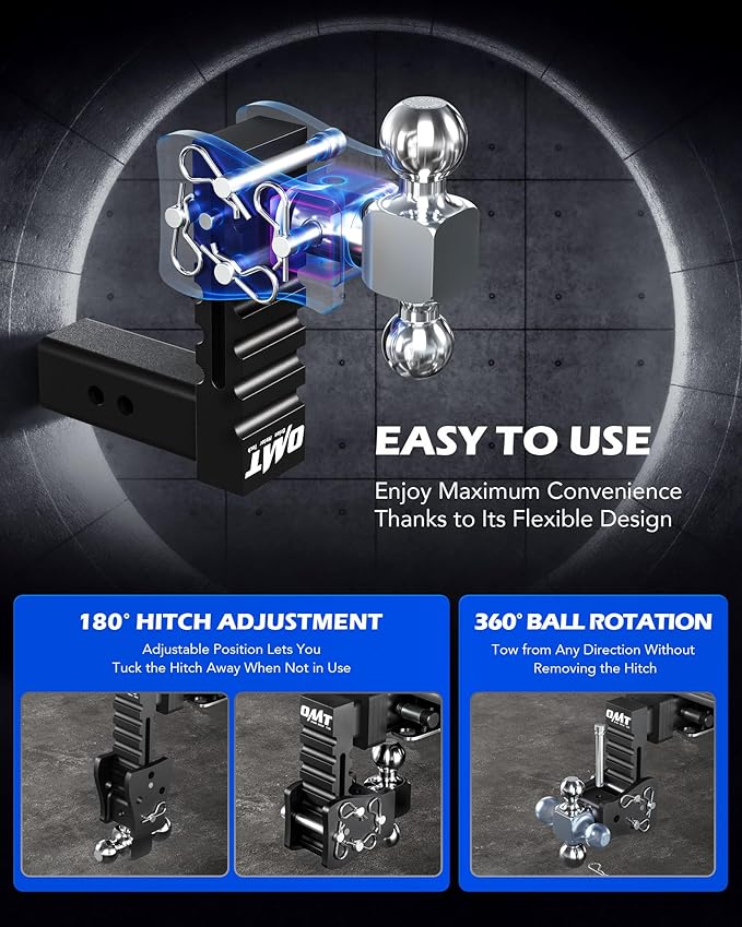 - INVISIBLE GUARDIAN MODE: Stows in 8 seconds, guards your shins & garage 24/7; This adjustable tow hitch offers a 5" drop or rise, plus a 360° rotatable ball for precise alignment and quick setup. When not in use, the stowable design lets you easily tuck it behind the bumper