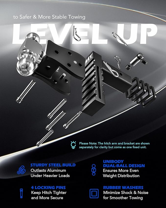 - Stable & Secure Towing: Our adjustable tow hitch comes with a locking hitch pin to prevent theft and 4 short hitch pins to keep your trailer tightly secured, while rubber washers help reduce rattle and bumps for a smoother tow