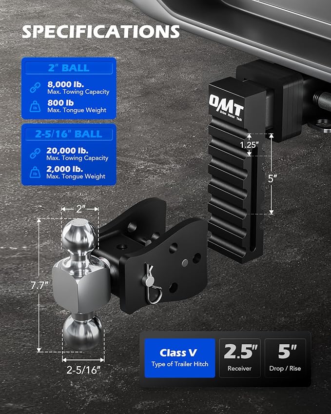 - Ultimate Towing Solution: Orion Motor Tech's adjustable trailer hitch features a dual-ball design, with the 2-5/16" ball rated for 20,000 lb. and the 2.5" ball for 8,000 lb., giving you the strength for any towing task